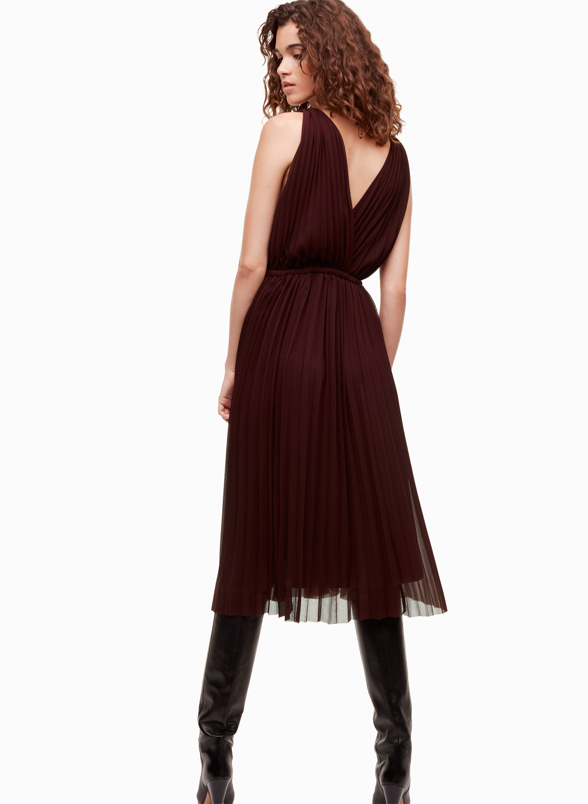 Aussi de chez Aritzia, j'adore cette robe plissée. C'est un modèle indémodable qu'on peut très facilement reporter par la suite, que ce soit pour Noël ou une sortie en ville. Je troquerais simplement les bottes cuissardes pour une paire d'escarpins afin de dévoiler les jambes et le tour est joué!