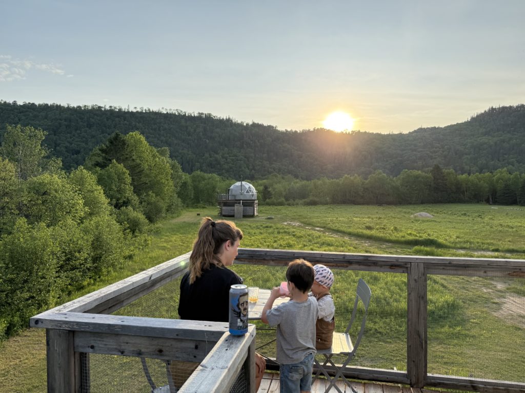 Nous sommes partis vendredi vers l'heure du dîner pour profiter de la sieste des garçons sur la route. Les parents aguerris comprendront que c'est le meilleur moment pour tenter de faire le plus de kilomètres entre Montréal et La Tuque. Nous avons fait un arrêt rapide à Trois-Rivières pour faire notre épicerie, nous dégourdir les jambes et faire le plein. Nous sommes donc arrivés en fin d'après-midi chez Méandre. De la route, on a tout de suite aperçu les dômes imposants et majestueux sous le soleil de juin. Nous avions hâte de voir l'intérieur et avons été étonnés par leur taille! Les dômes sont, en fait, sur une plateforme de bois sous laquelle se trouve un coin salon et détente, un coin repas, un immense hamac, une balançoire et même un barbecue.