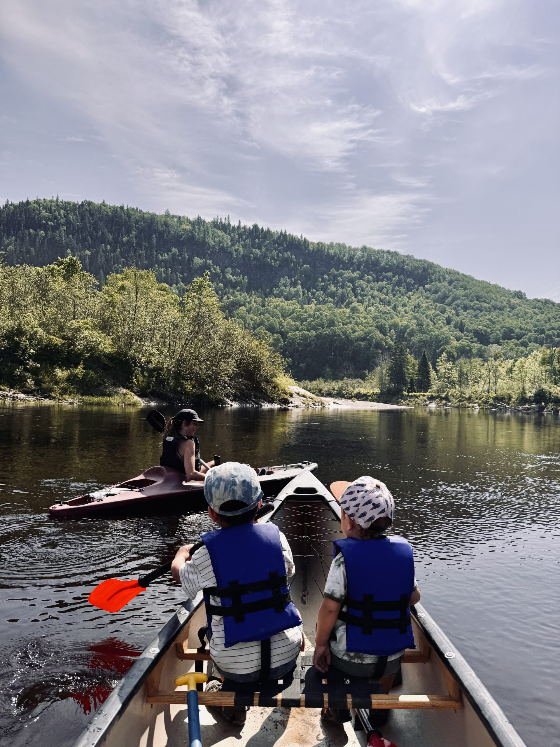 La deuxième journée se veut presque deux jours en soi tant on en a profité et tant on a fait d'activités. En se réveillant, jamais je n'aurais imaginé que mes fils auraient autant embarqué dans tout, mais le plein air est spécial avec les enfants et leur permet de jouer avec nous comme ils ne le font pas nécessairement à la maison, alors on a réussi à faire plus de choses en moins de temps. Tout d'abord, nous sommes allés faire une descente de rivière. J'ai opté pour un canot avec mes deux garçons, alors que mon amie a pris un kayak simple. La descente de rivière se fait très bien avec des enfants: on peut choisir la durée du parcours selon le temps qu'on veut passer sur l'eau. Il est aussi possible de profiter des plages le long du trajet et de faire un pique-nique sur l'une d'elles. De plus, pour les plus aventuriers, on peut choisir de faire du canot-camping.