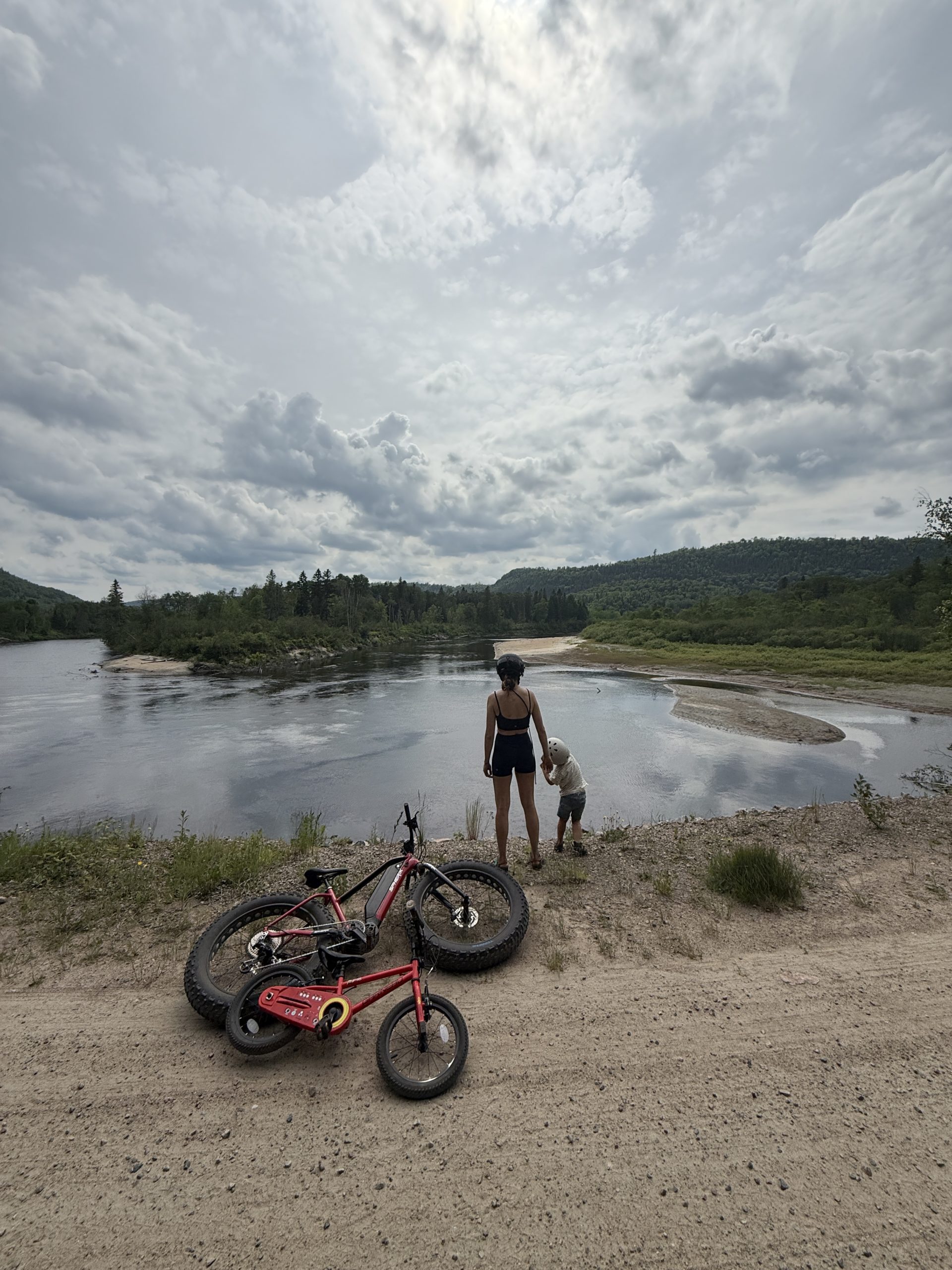 En après-midi, j'ai mis mon fils de un an et demi sur mon dos en porte-bébé avec un casque et mon plus grand sur son vélo avec son casque. Vanessa et moi avions accès aux vélos électriques qu'on peut louer chez Méandre. Comme le site est presque à la fin d'une route, on roule peu longtemps pour atteindre un chemin forestier qui permet d'avoir divers beaux points de vue de la rivière Croche.