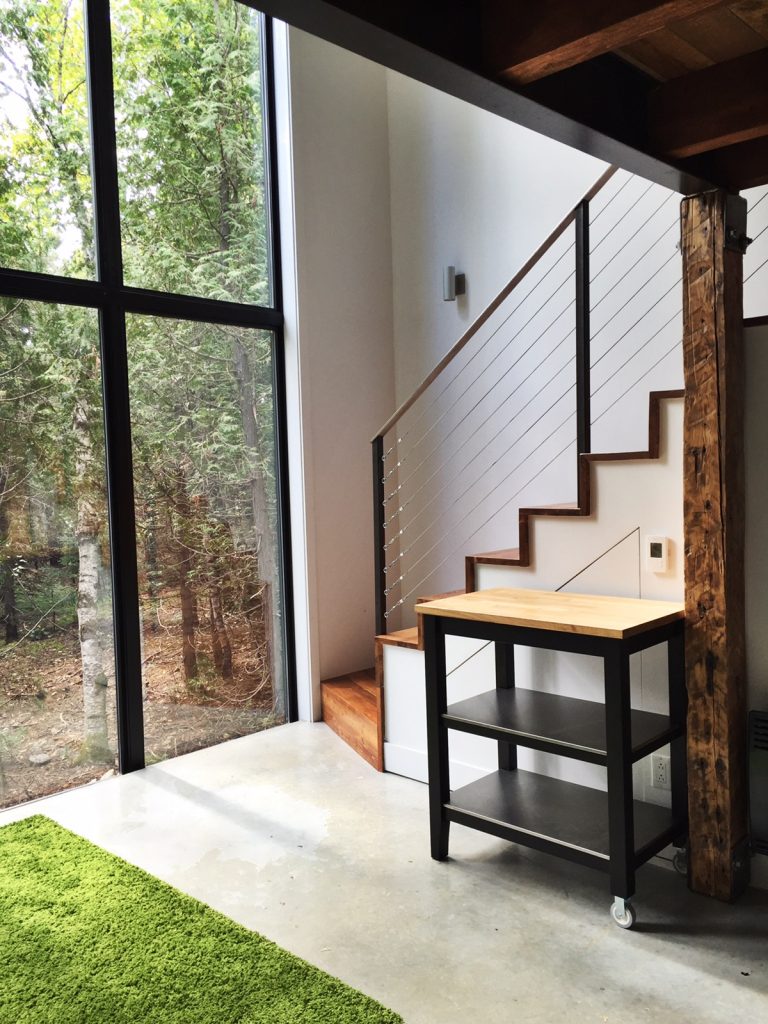 Le premier soir, on a eu la chance de découvrir le chalet MASHK qui peut accueillir jusqu'à 4 personnes dans un micro-chalet comportant une mezzanine et une terrasse sur le toit. Ce qui frappe, c'est le design moderne de l'habitation et l'ouverture sur la nature qu'offre le très grand mur vitré qui laisse entrer tout le soleil dès le matin. Pas besoin d'apporter beaucoup de bagages, le MASHK a une cuisine complète, une salle de bain et un petit coin foyer à l'extérieur.