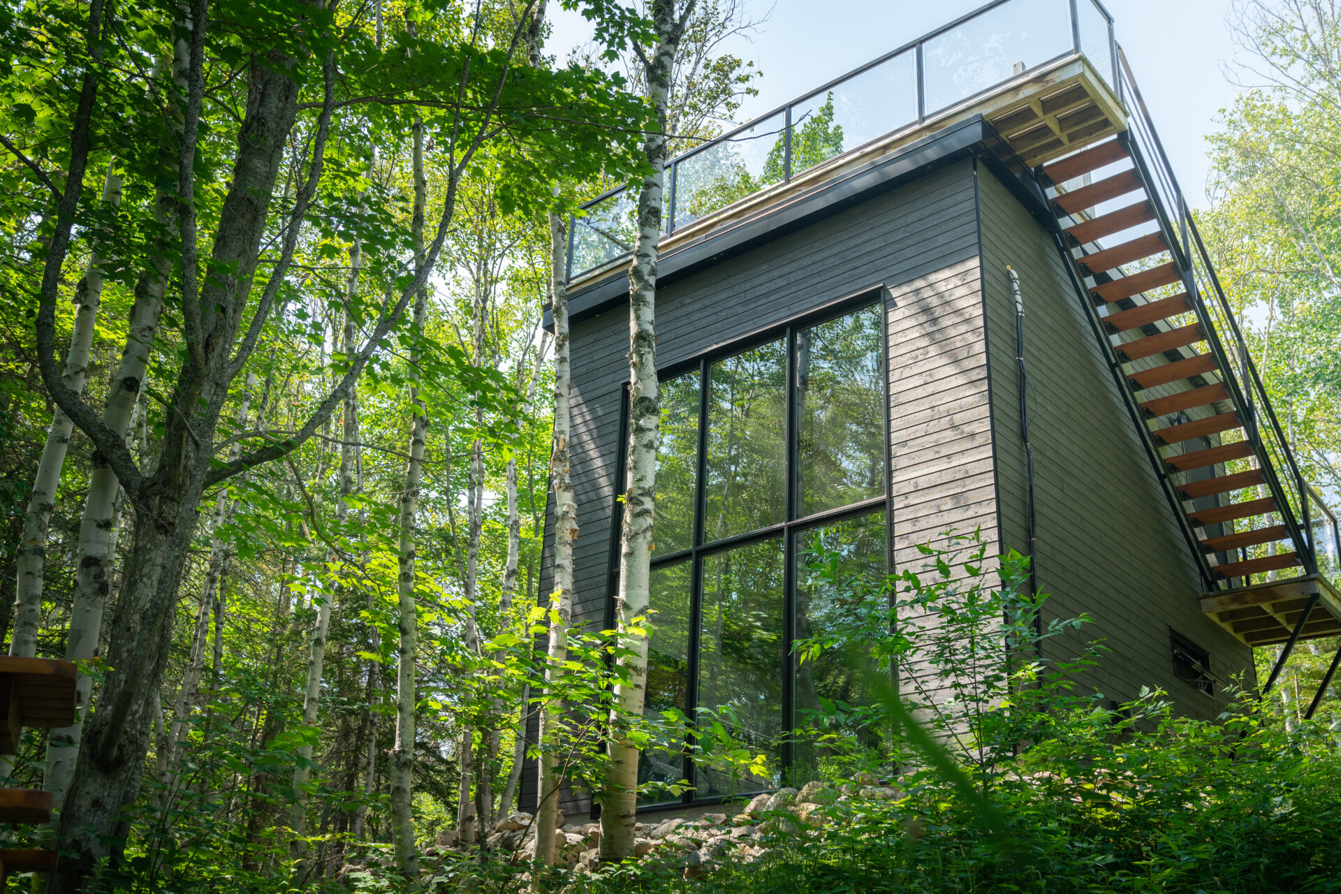 Le premier soir, on a eu la chance de découvrir le chalet MASHK qui peut accueillir jusqu'à 4 personnes dans un micro-chalet comportant une mezzanine et une terrasse sur le toit. Ce qui frappe, c'est le design moderne de l'habitation et l'ouverture sur la nature qu'offre le très grand mur vitré qui laisse entrer tout le soleil dès le matin. Pas besoin d'apporter beaucoup de bagages, le MASHK a une cuisine complète, une salle de bain et un petit coin foyer à l'extérieur.