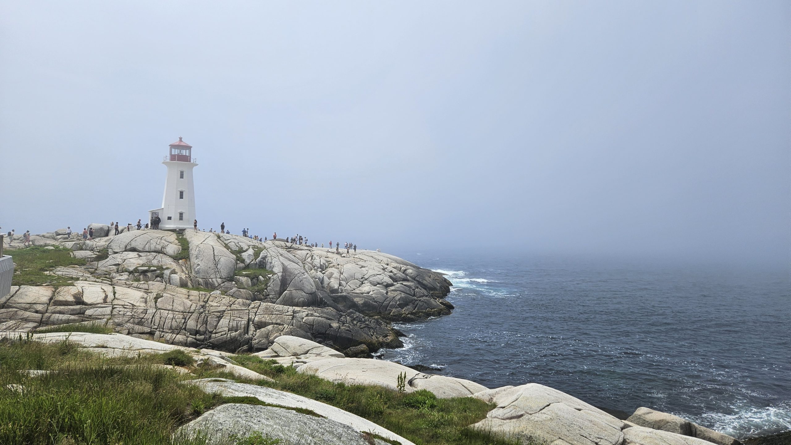 Nous arrivons ensuite dans le petit village parsemé de maisons colorées. Très bucolique ! À quelques minutes de marche se trouve le superbe phare de Peggy's Cove, lui aussi traversé par des bancs de brume. Le bruit du ressac est perceptible, mais nous ne voyons pas la mer. Des roches lisses, comparables à de la peau d'éléphant (oui, oui, ça existe!), entourent le pied du phare et permettent au public de circuler autour de celui-ci. Après un dîner à base de homard au Sou’Wester Gift and Restaurant, le soleil décide de se pointer le bout du nez. L'ambiance change drastiquement et tout devient lumineux : la mer bleue apparaît enfin et la coupole rouge du phare nous saute aux yeux. Cela permet d'admirer l'ensemble du portrait! Un paysage à couper le souffle!